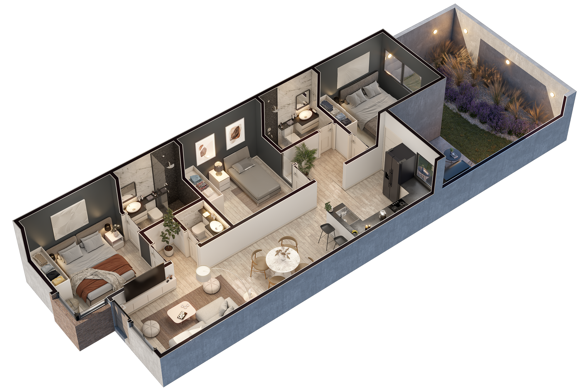 With a modern and functional design, each unit offers spacious and comfortable living areas, with more than 120 m² of total private space. These outstanding residences feature 3 bedrooms, including a master suite with private bathroom, plus two additional bedrooms sharing a full bathroom. A guest bathroom adds extra convenience.